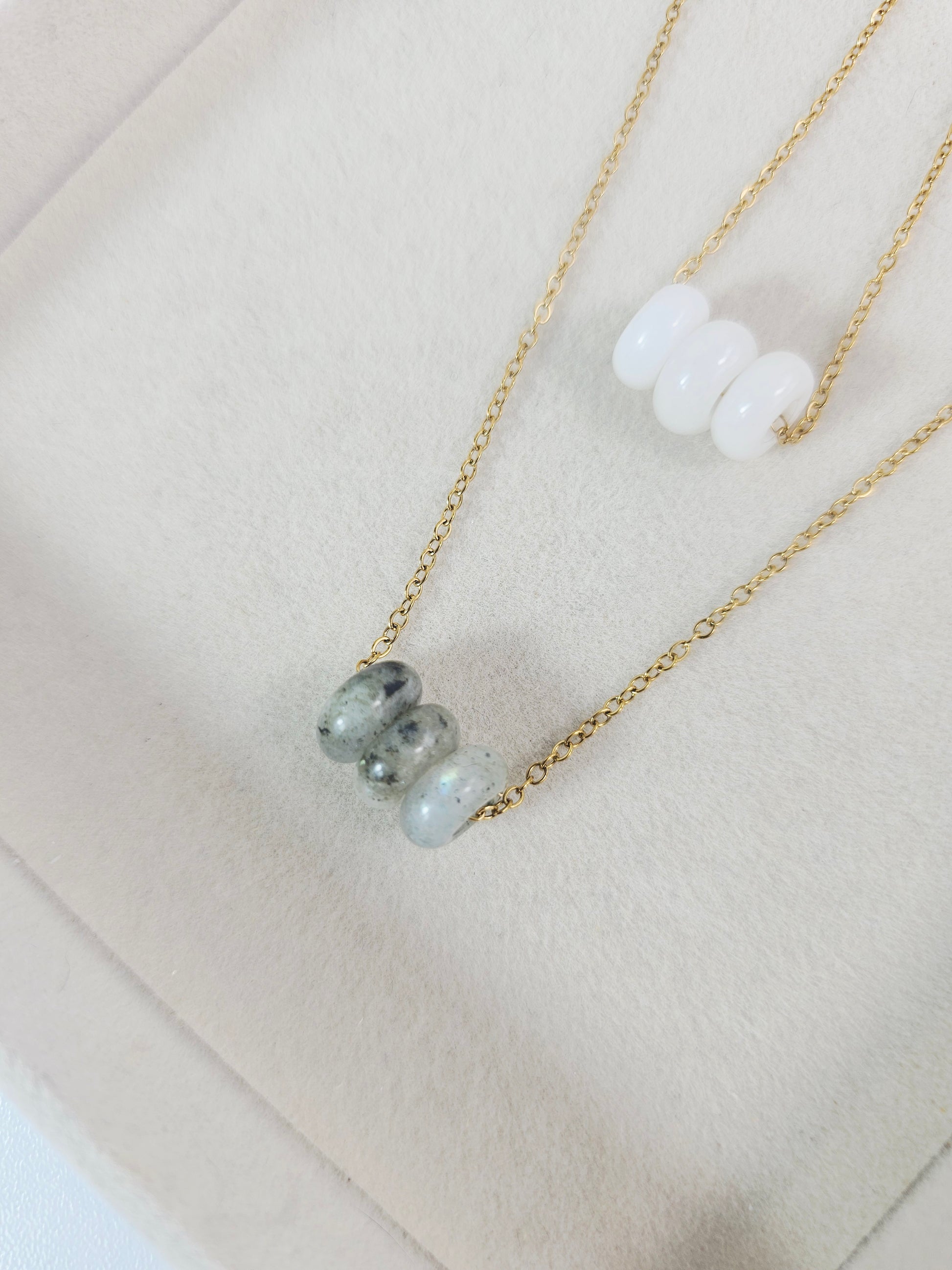 Les perles de jade coulissent sur la chaîne. Vous pouvez donc retirer ou laisser les perles de pierre selon vos goûts. Vous obtiendrez ainsi des effets différents selon le nombre de perles portées.