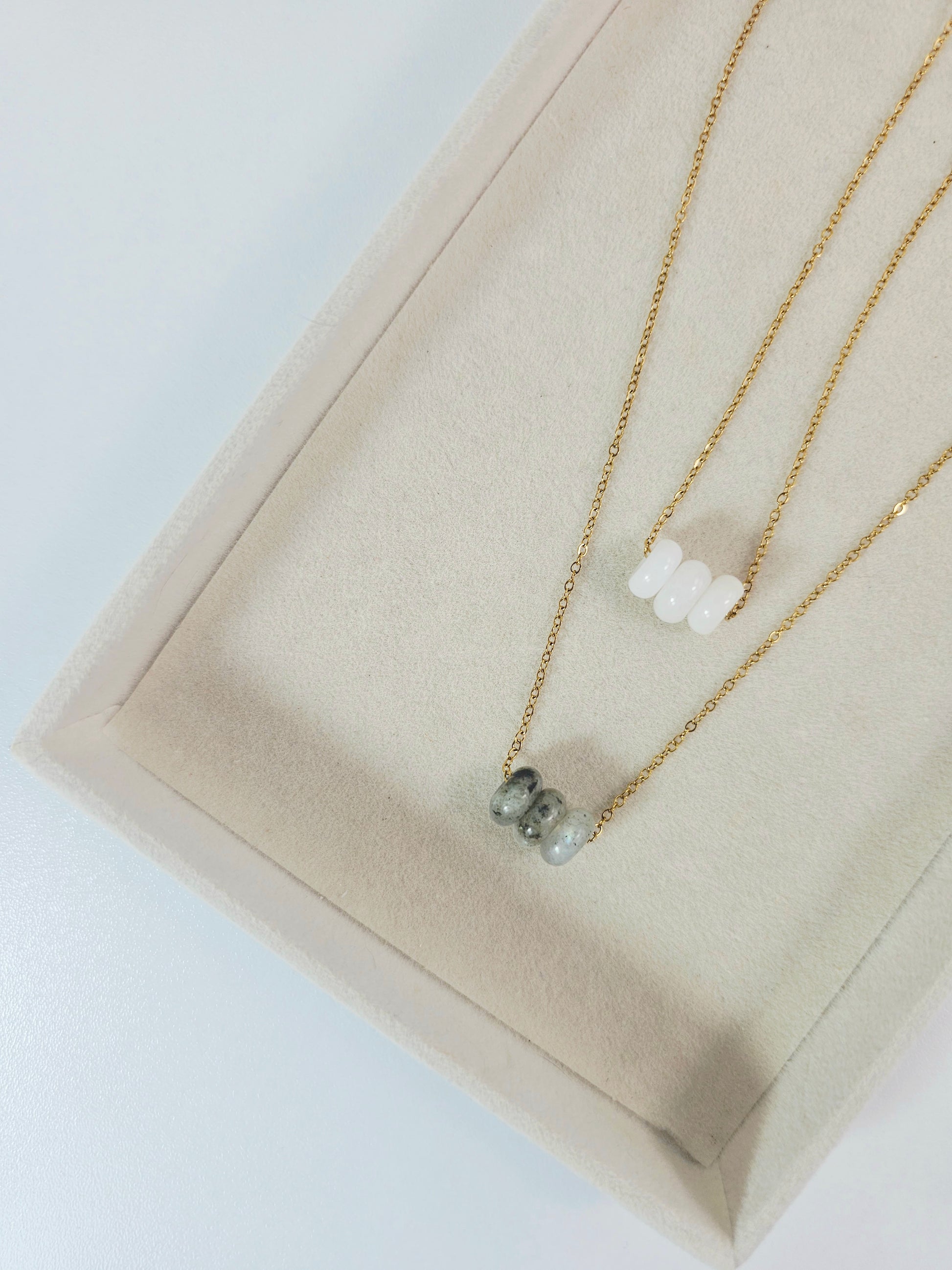 Les perles de labradorites coulissent sur la chaîne. Vous pouvez donc retirer ou laisser les perles de pierre selon vos goûts. Vous obtiendrez ainsi des effets différents selon le nombre de perles portées.