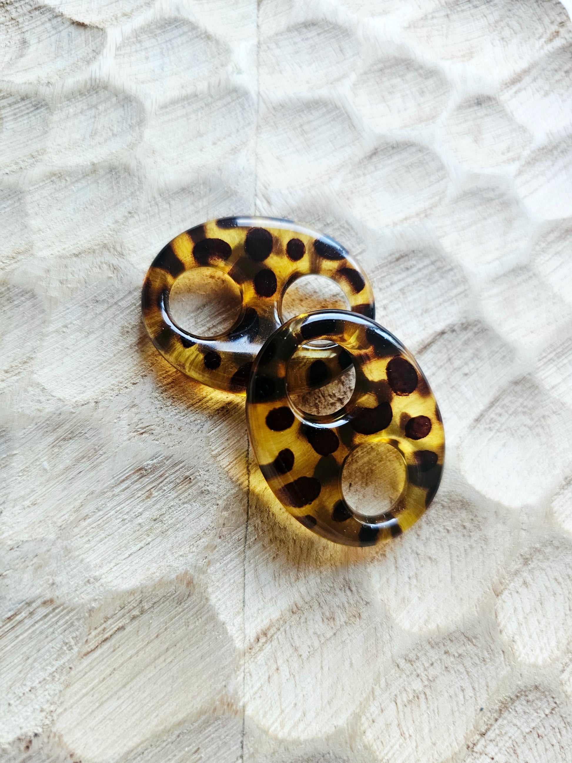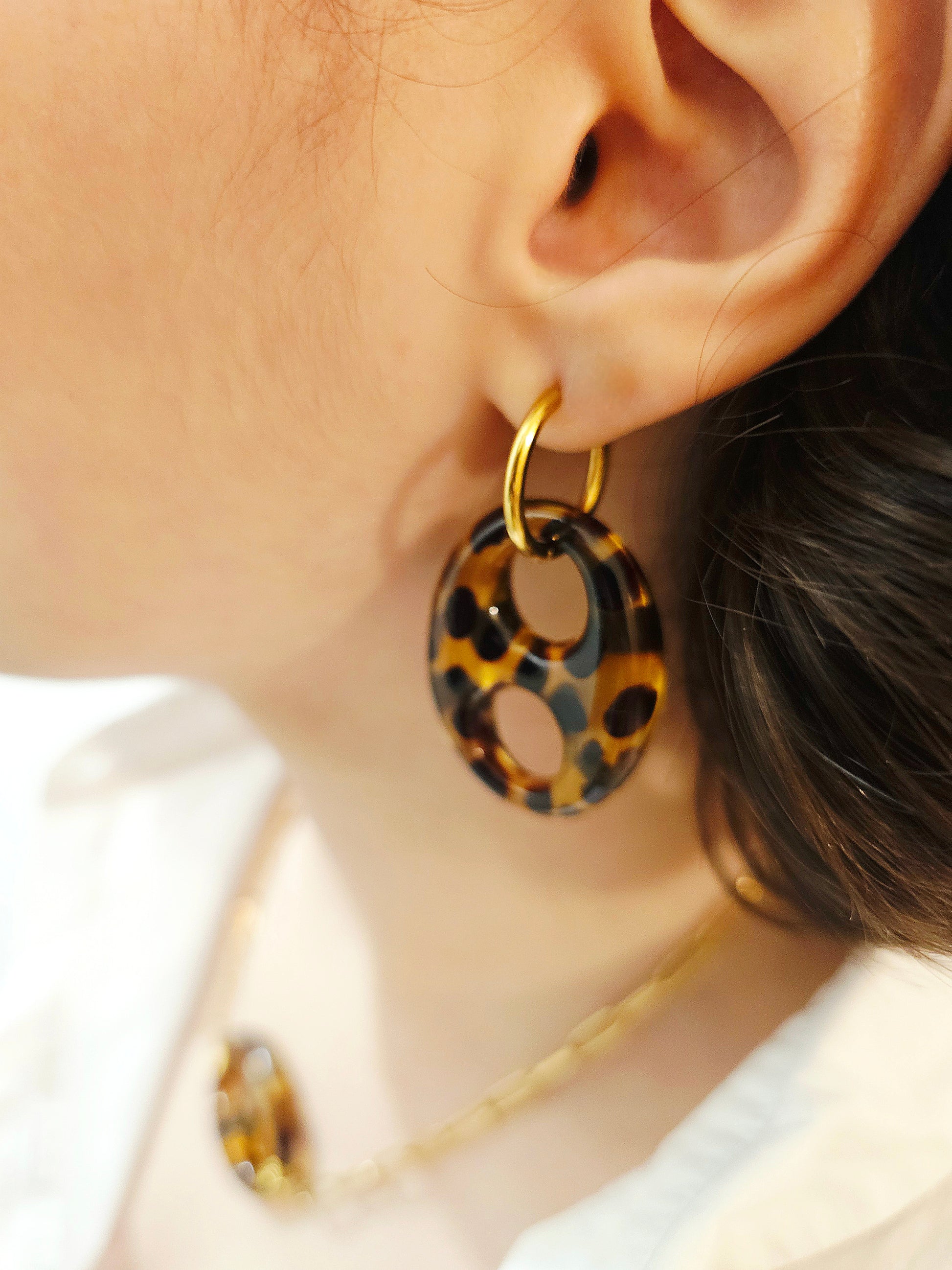 Pendentif aux motifs léopard faits de résine acrylique vendus par deux sans la créole en acier inoxydable dorées.